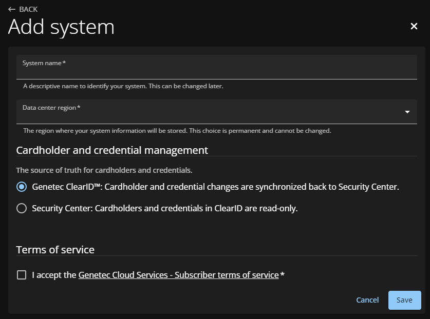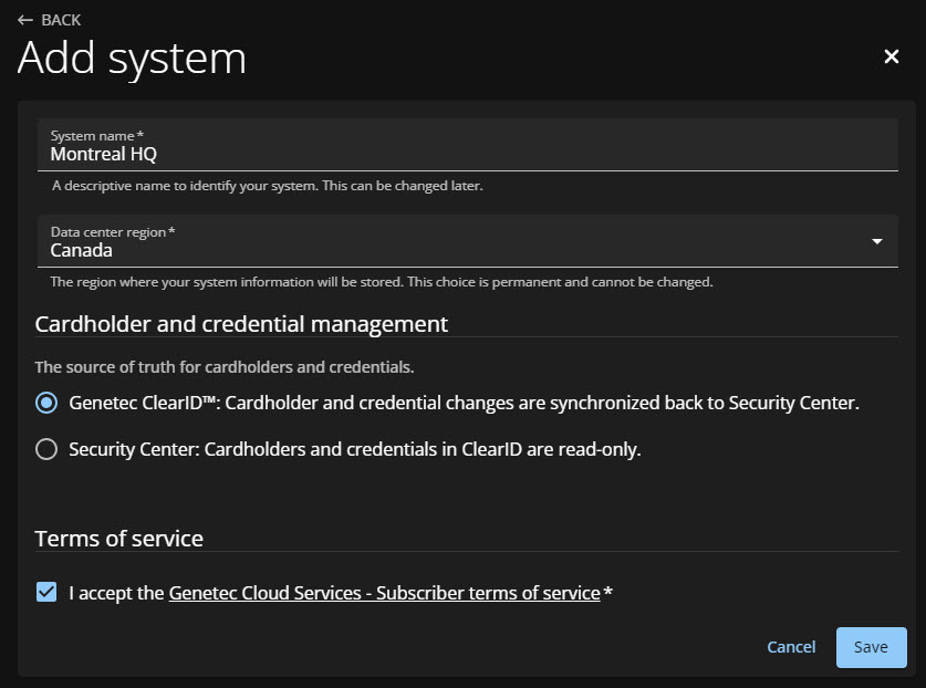 Use un nombre de sistema que represente el nombre de la cuenta y la región del centro de datos asociado. Por ejemplo, GenetecEuropeSC.