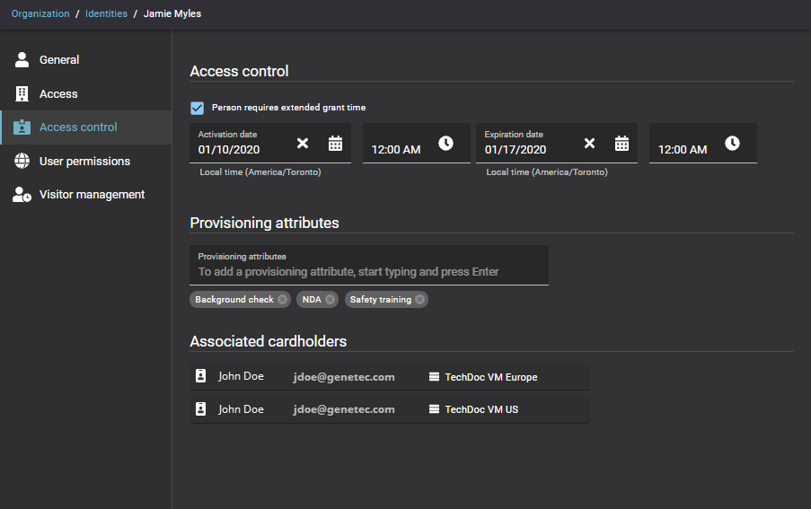 Cuando los atributos predeterminados de la política de Genetec ClearID™ no satisfacen sus necesidades, puede asignar atributos de aprovisionamiento personalizados de manera manual a un registro de identidades de empleados. Luego, estos atributos se pueden usar en una política de control de acceso basado en la función.