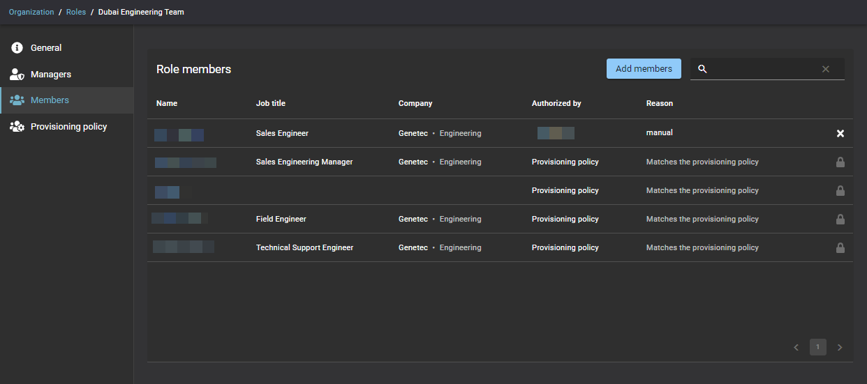 - Cuando una política de aprovisionamiento está habilitada, los miembros de función se agregan de manera automática en función de las reglas definidas en la política. Los miembros de función que se agregan de manera automática se muestran en la columna de Autorizado por como Política de aprovisionamiento.