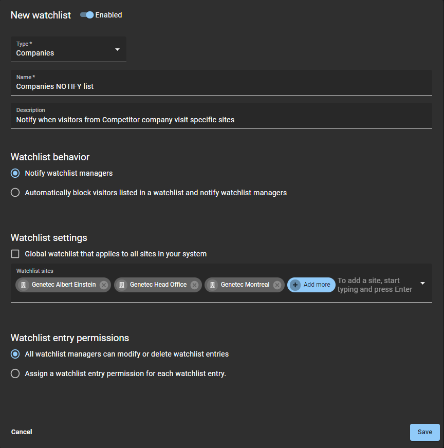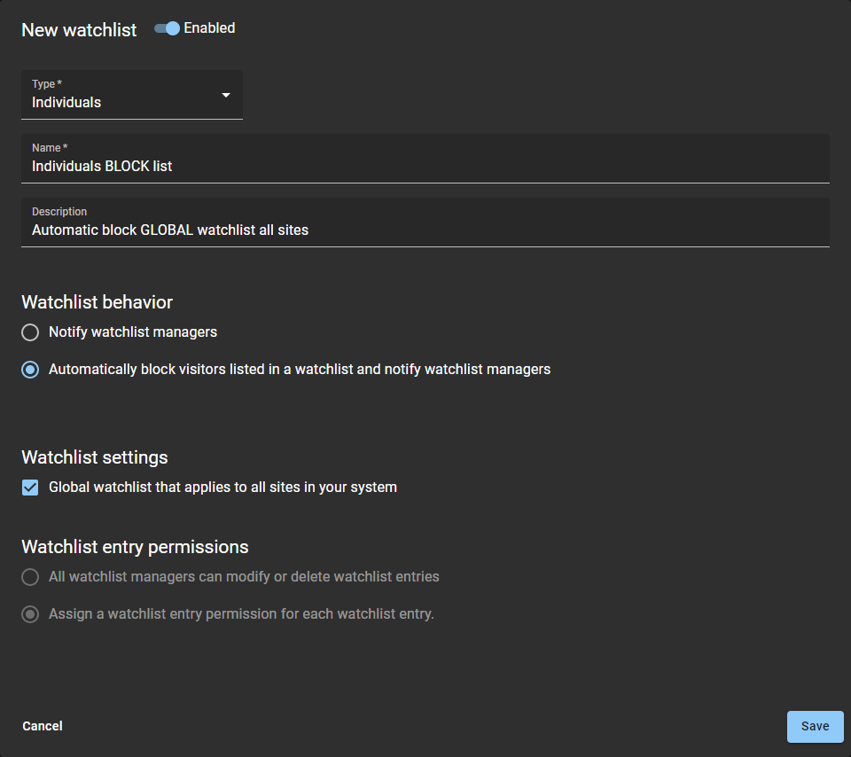 Figura 1. Ejemplo 1: Lista de seguimiento de bloqueo de personas. Configurada como una lista de seguimiento global para bloquear de manera automática a los visitantes y notificar a los administradores de la lista de seguimiento.