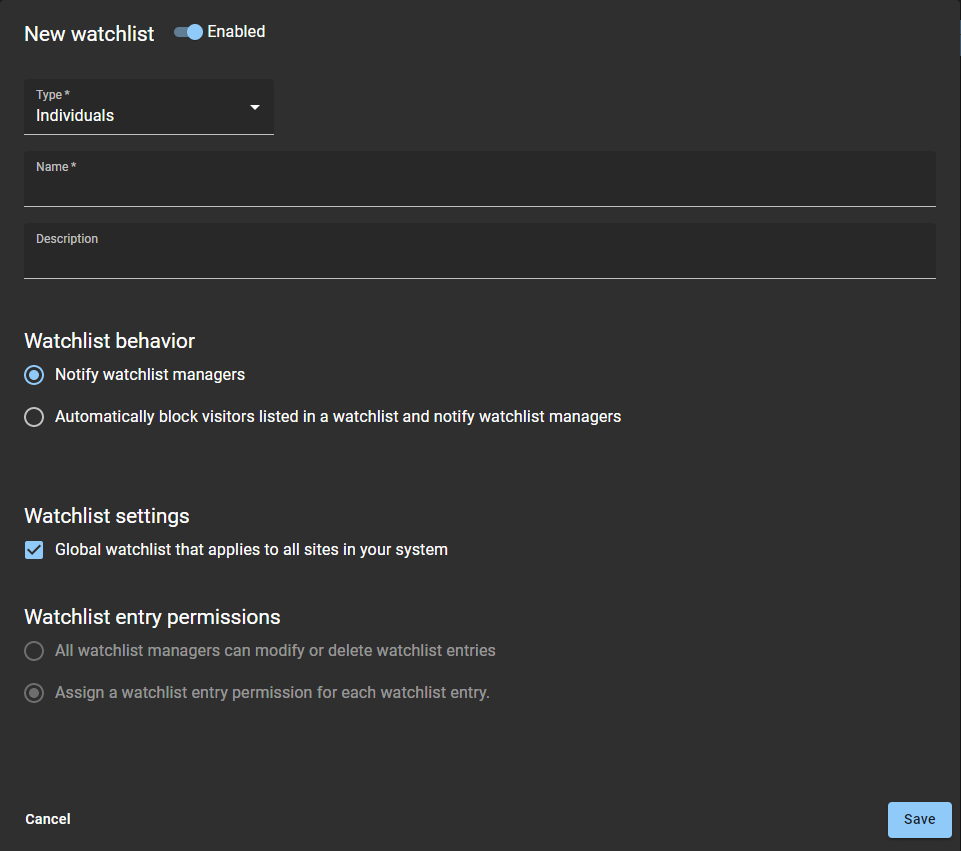 Una lista de seguimiento de Personas se utiliza para monitorear los registros de visitantes de las personas de interés que figuran en una lista de seguimiento y luego tomar las medidas que se especifican en la configuración de la lista de seguimiento. Por ejemplo, puede crear una lista de seguimiento de personas para bloquear de manera automática a los visitantes que figuran en una lista de seguimiento y notificar a los administradores de la lista. Para otras situaciones, puede notificar solo a los administradores de listas de seguimiento. También puede crear una lista de seguimiento de personas para notificar a todos los administradores de la lista de seguimiento cuando se registren VIP en su sitio.