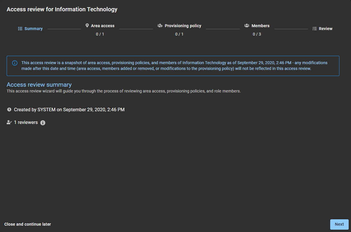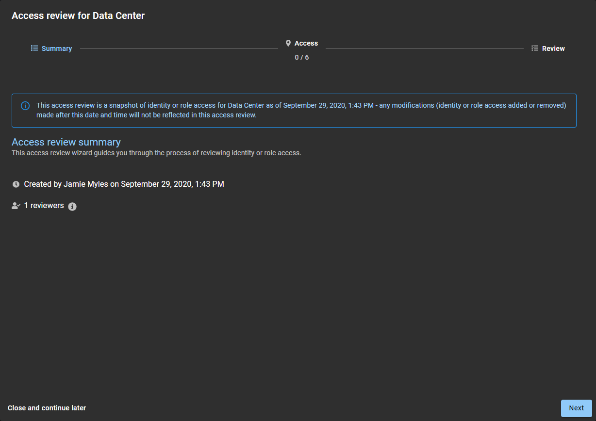 3. Haga clic en Siguiente para continuar con la siguiente sección del asistente de revisión de acceso.