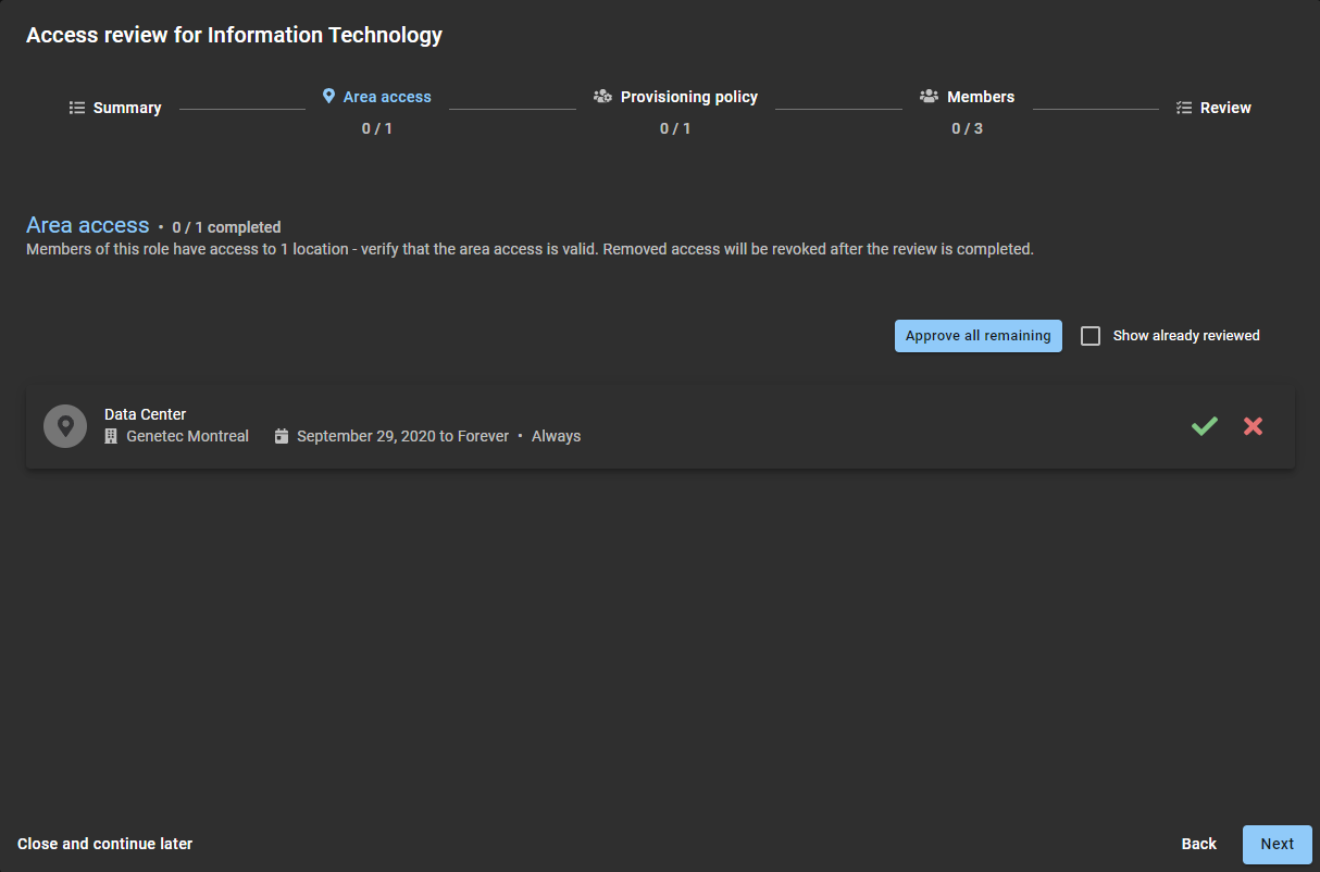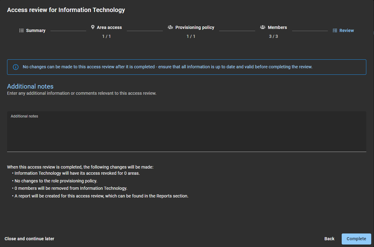 4. En la sección de Detalles de la revisión de acceso al área, verifique los detalles del resumen.