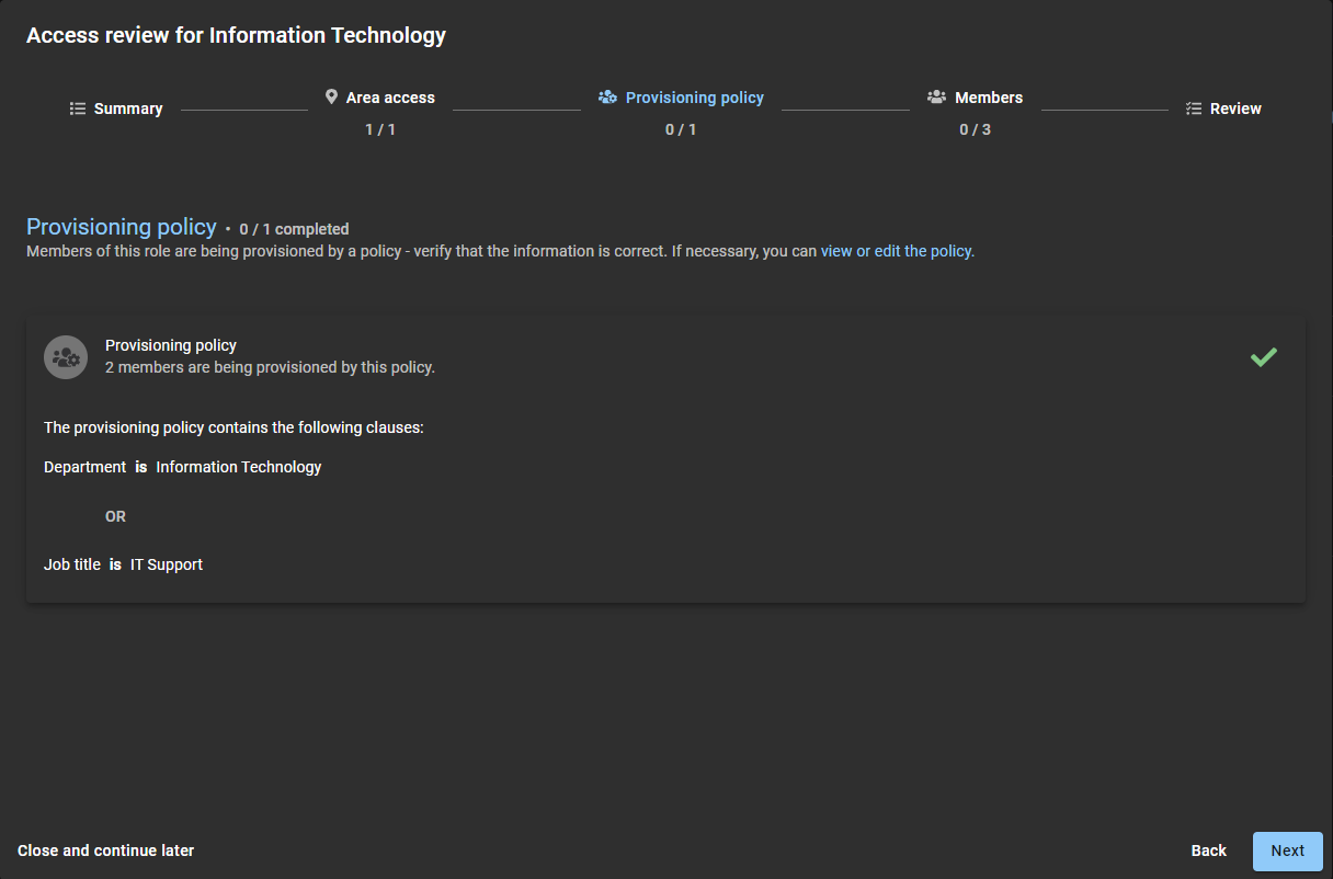 6. En la sección de Política de aprovisionamiento de la revisión de acceso a funciones, confirme que las políticas siguen siendo válidas.