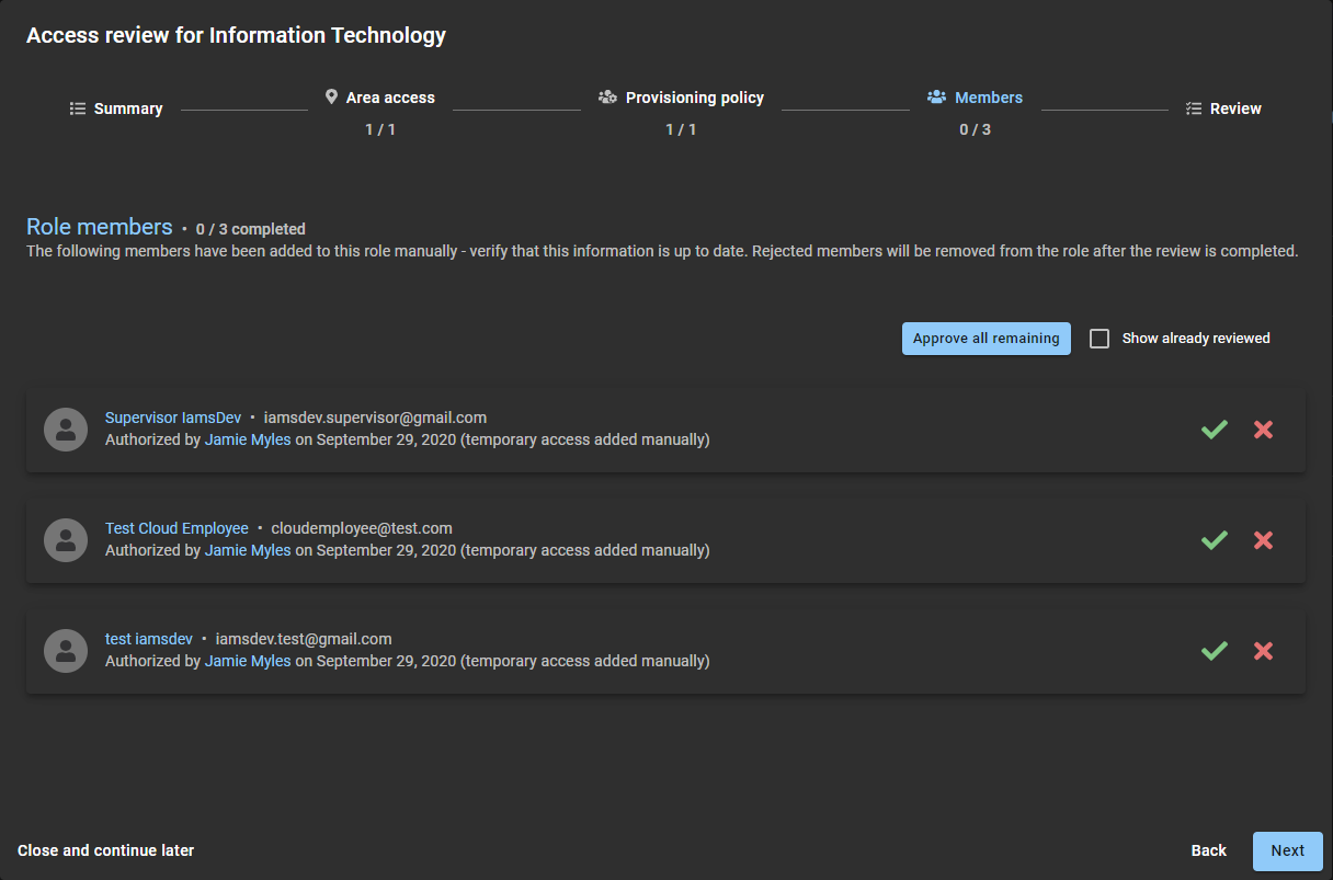 7. En la sección Miembros de la revisión de acceso a funciones, confirme que los miembros siguen siendo válidos.