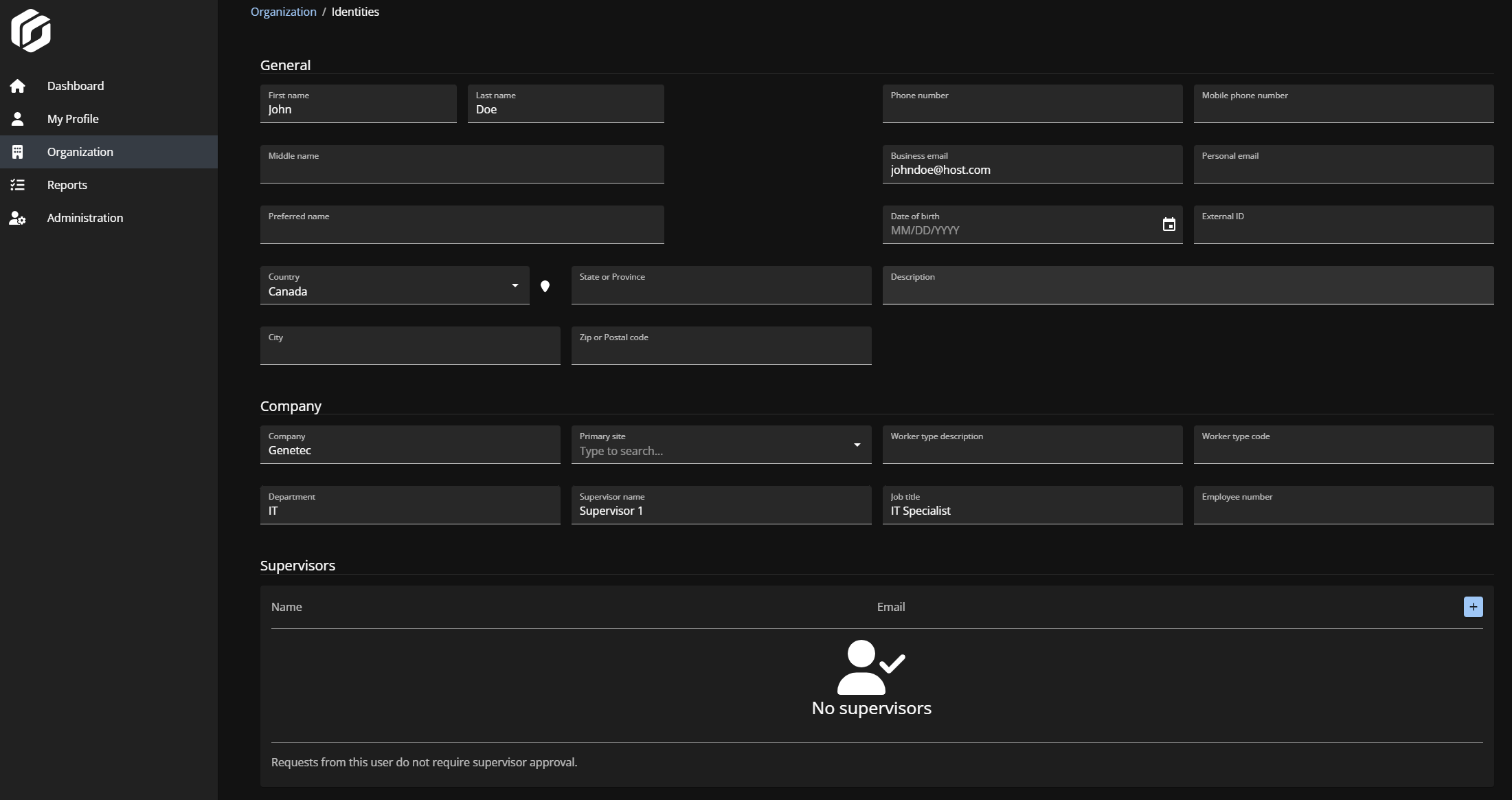 Los administradores de cuentas pueden crear identidades de manera manual en Genetec ClearID™ por separado de los procesos de importación masiva y sincronización. Por ejemplo, los contratistas, integradores de sistemas u otros usuarios pueden necesitar identidades únicas.