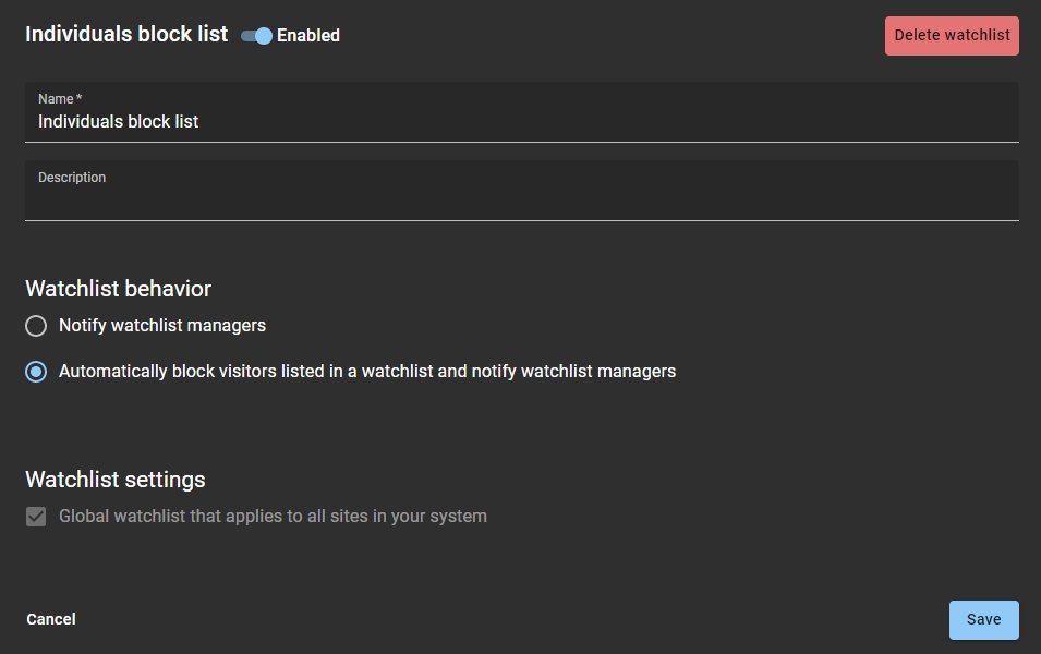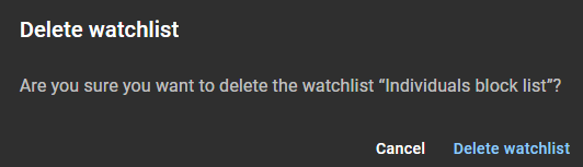Cualquier administrador de listas de seguimiento o administrador de cuentas puede eliminar listas de seguimiento que estén configuradas como lista de seguimiento global.