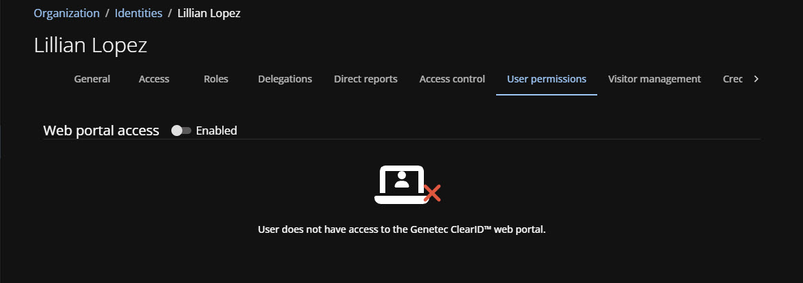 Antes de que un usuario pueda tener acceso al portal web Genetec ClearID™, debe otorgarle los permisos necesarios para el sitio web.