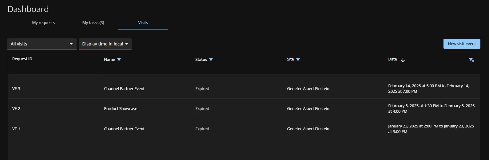 Los propietarios del área, el equipo de seguridad y recepción pueden revisar las visitas o eventos actuales o futuros de sus áreas. Las visitas se pueden solicitar para recibir a empleados de otros sitios, contratistas de mantenimiento, citas, reuniones, entrevistas, visitas de clientes, conferencias de socios de negocios y demás.