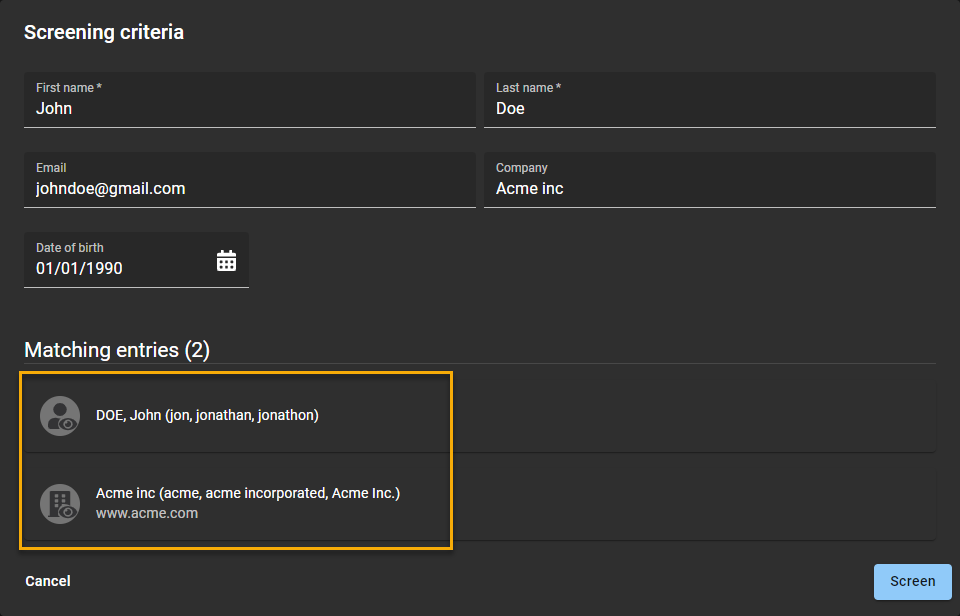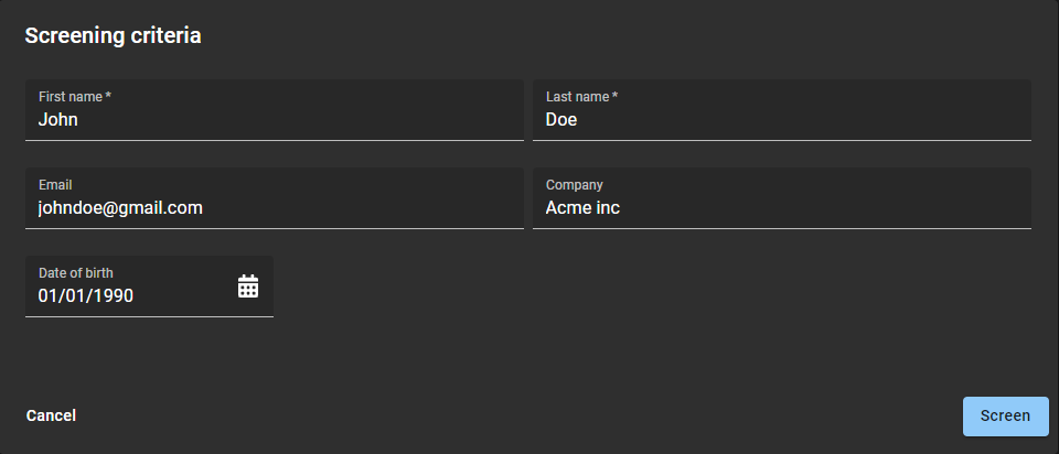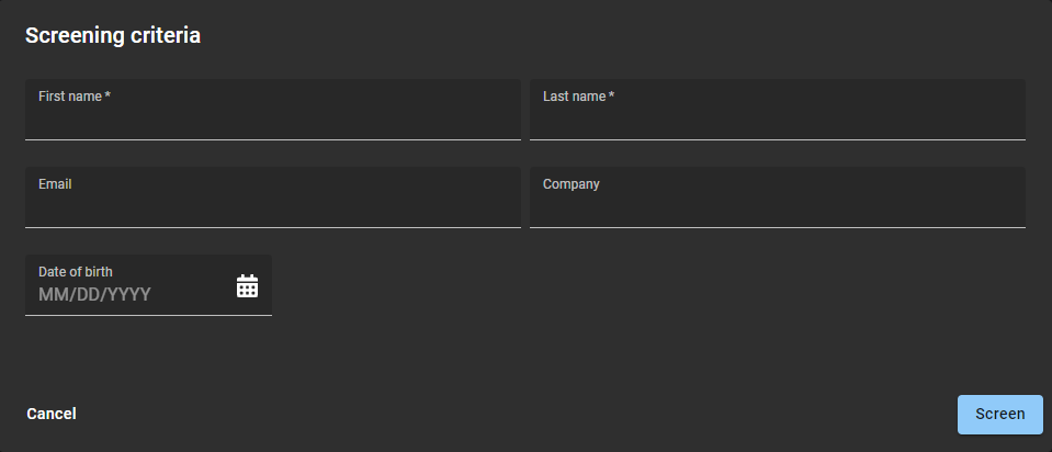 Para analizar de forma manual a un visitante, puede introducir los detalles del visitante para verificar si hay una coincidencia de análisis. Por ejemplo, probar una nueva lista de vigilancia para encontrar listas de vigilancia que contengan una persona o empresa de interés, o para validar una nueva contratación con una lista de vigilancia interna.