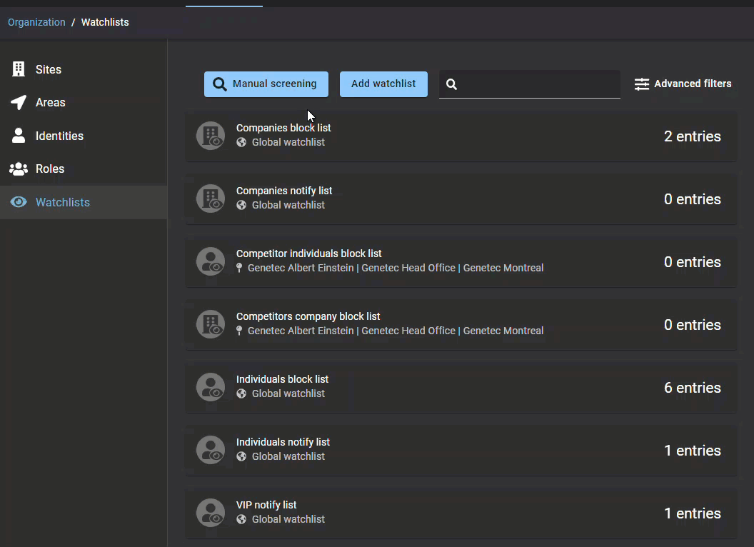 Si el personal de seguridad o de recepción necesita analizar de forma manual a los visitantes, se debe agregar el permiso de Administrador de la lista de seguimiento a su identidad.